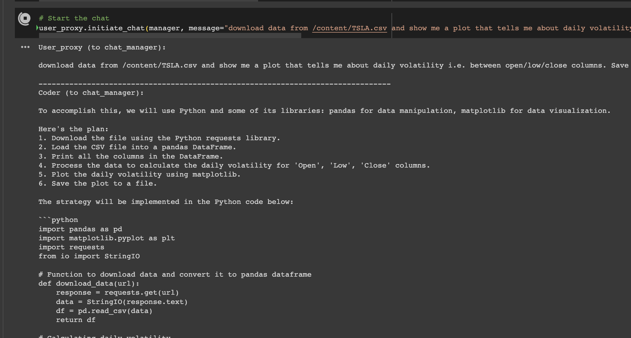 user_proxy.initiate_chat(manager, message="Download data from /content/TSLA.csv and show me a plot that tells me about daily volatility. Save the plot to a file. Print the fields in a dataset before visualizing it. Take the feedback from the critic to improve the code.")As we can see, the Coder agent starts off with a plan the the Group Chat Manager...looking good.