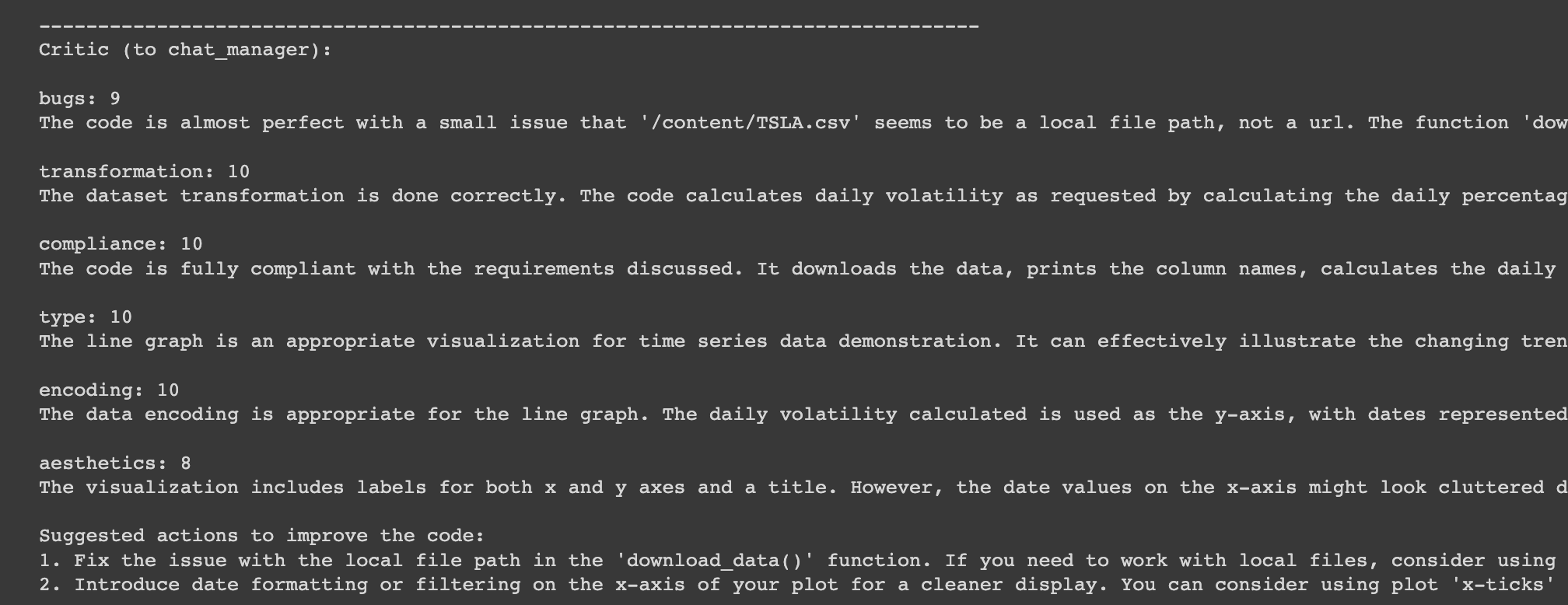 In this data visualization example, we saw how by pairing a coder with a critic, the agents can accomplish tasks fully autonomously.