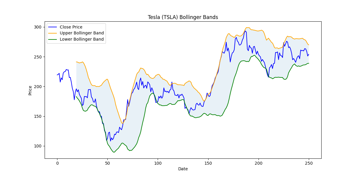 Plot Bollinger bands to visualize volatility and price levels over the time period.