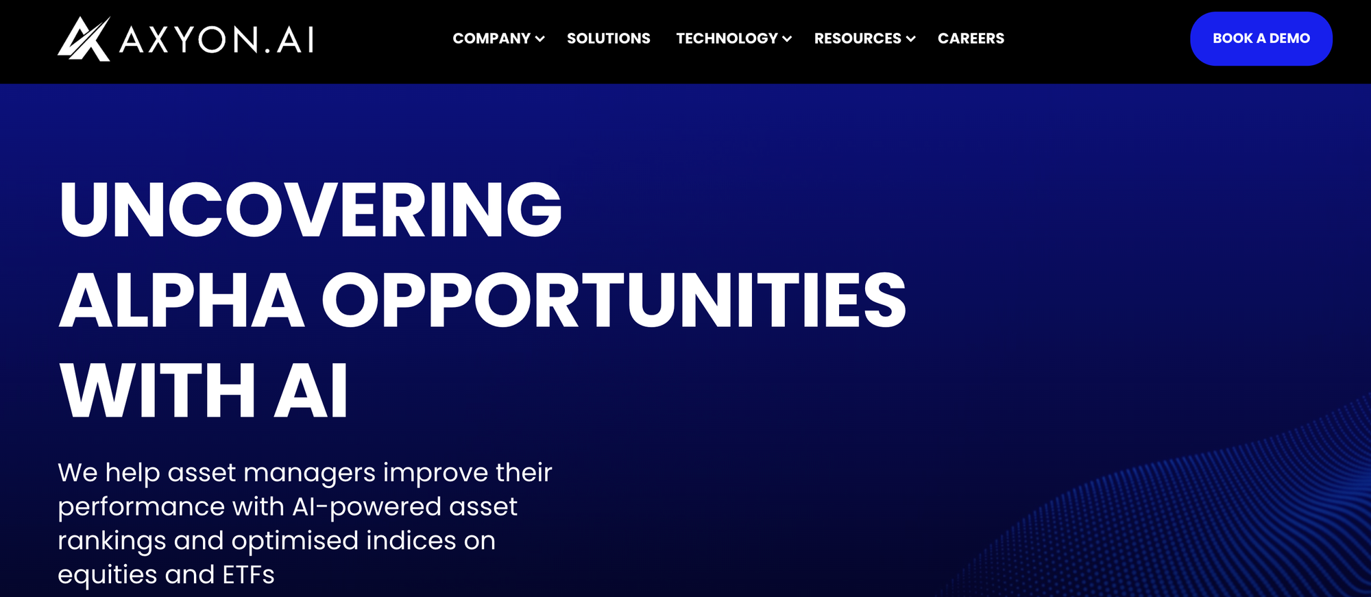 - What they do: Axyon AI leverages deep learning to create bespoke business applications for capital markets and asset management. The fintech has two core products: SynFinance brings AI-powered analytics and prediction to loans syndication. IRIS provides asset managers with customised prediction feeds to improve their performance strategies.