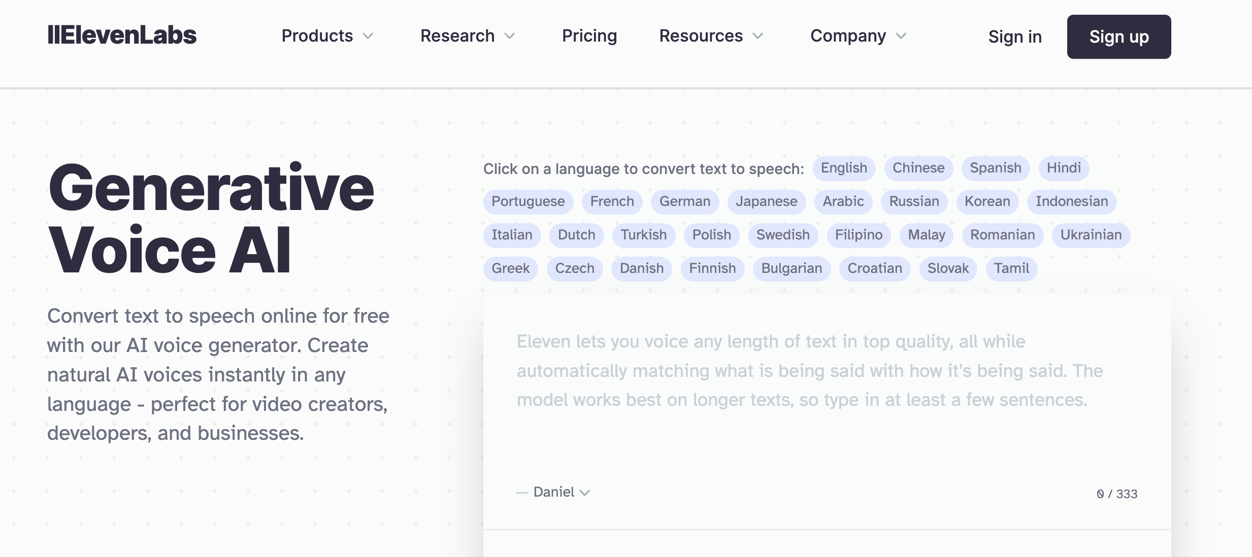 - What they do: Convert text to speech online for free with their AI voice generator. ElevenLabs researches and deploys novel methods in generative voice AI to make content in any language and voice. The company's mission is to make content universally accessible in any language and voice.