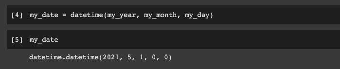 my_date = datetime()As we can see, this takes in year, month, day, and time—let's pass these arguments in: