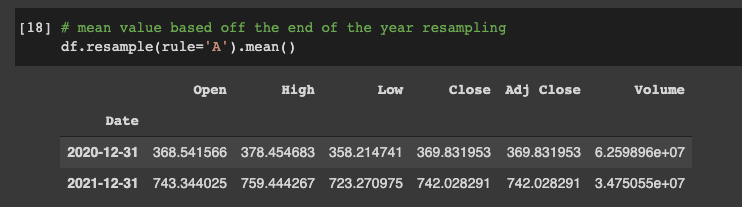Let's look at an example of the A rule, which stands for "year-end frequency" and we will get the mean value based off the resampling: