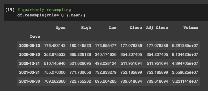To do any sort of time resampling we need a datetime index, and then we can resample the DataFrame with df.resample() and then we pass in a rule.