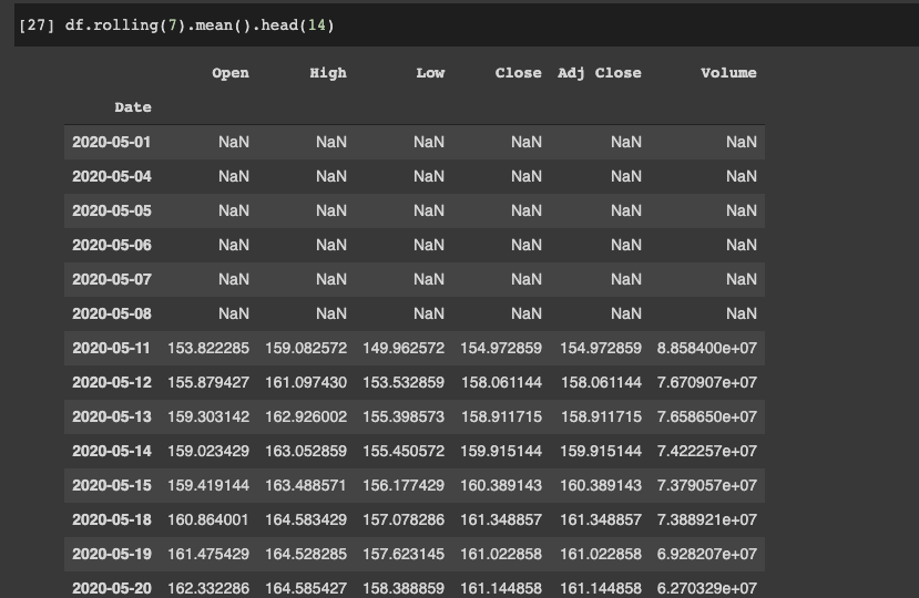 We can see the first 6 values are null, and the 7th value is the mean of the first 6 rows.