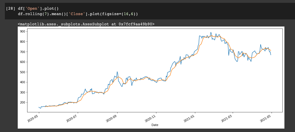 When we look at this plot we see that the blue line is the Open price column, and the orange line is the rolling 7-day Close price.