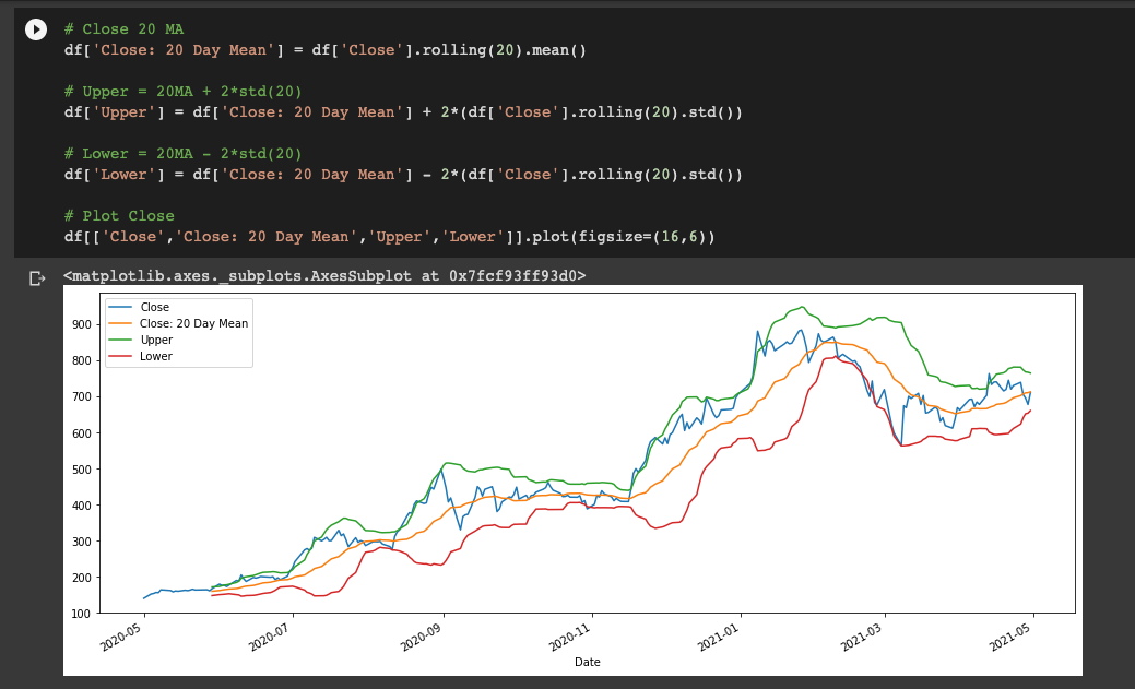 We'll look at more fundamental & technical analysis later, but one closely related topics to .rolling() are Bollinger Bands so let's briefly discuss them.
