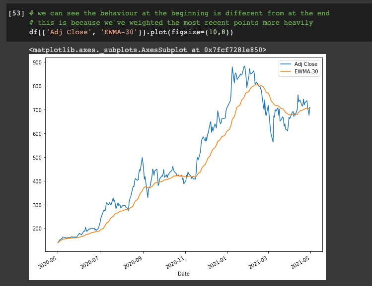 df['EWMA-30'] = df['Adj Close'].ewm(span=30).mean()