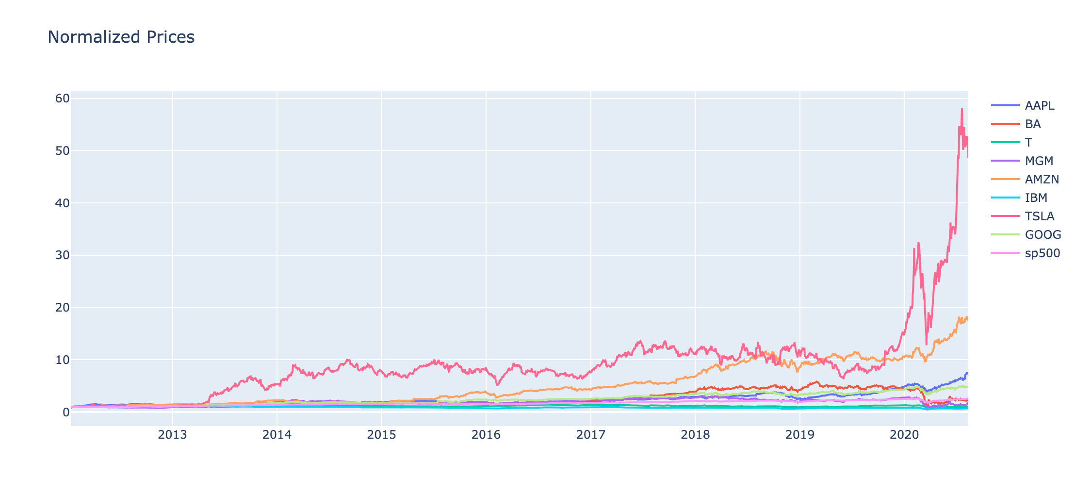 fig.show()interactive_plot(normalize(stocks_df), 'Normalized Prices')