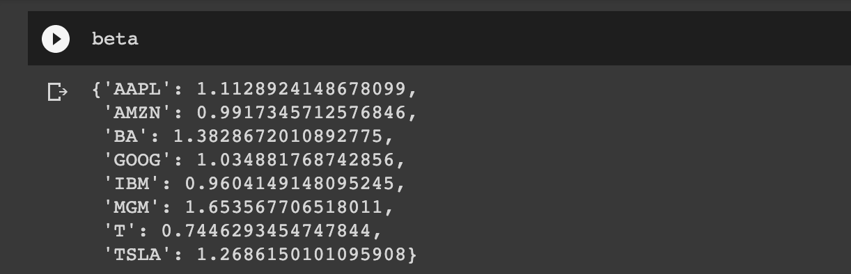 The first step is to create two empty dictionaries that will hold the beta and alpha of each stock. Alpha describes the strategy's ability to beat the market (S&P500):