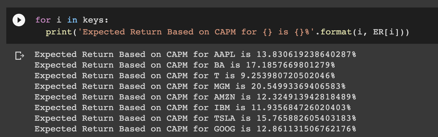 Next we will create a for loop and apply the CAPM formula to each individual stock as follows: