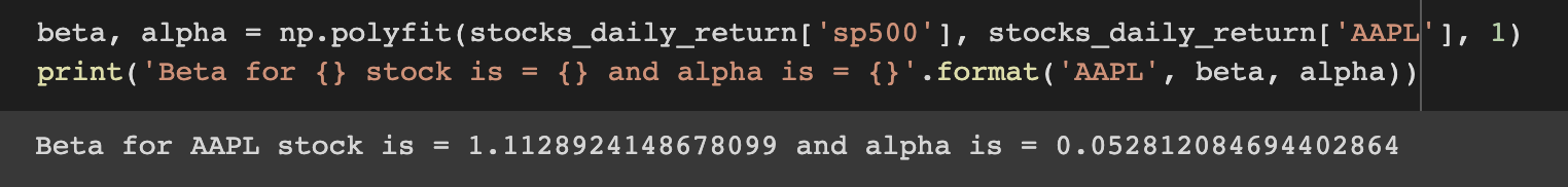 Next we will calculate the beta and alpha of an individual stock relative to the S&P 500. To recap, beta is the slope of the line regression line, or the market return vs. stock return, which we can calculate with np.polyfit:
