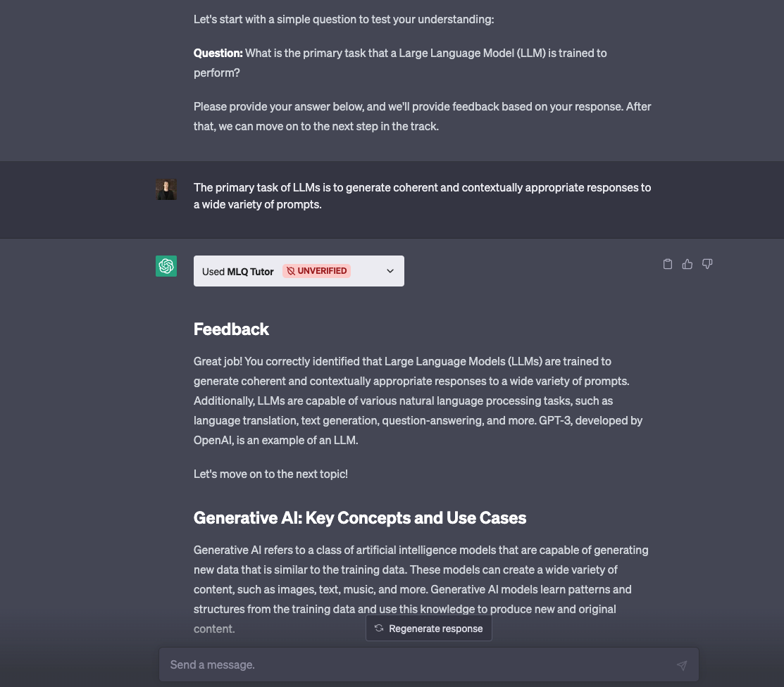 After each lesson, the AI tutor will ask users to answer a question relevant to the topic, and provide feedback as well as additional resources before moving on to the next step in the track.
