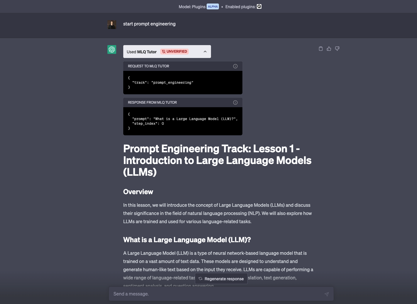 When this plugin is enabled, users can say things like "learn prompt engineering, which will enroll them in the appropriate educational track and start at lesson 1.