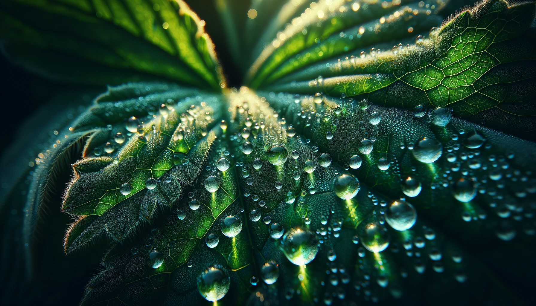 Close-up photograph of morning dew drops on a vibrant green leaf, highlighting the intricate patterns and reflections.