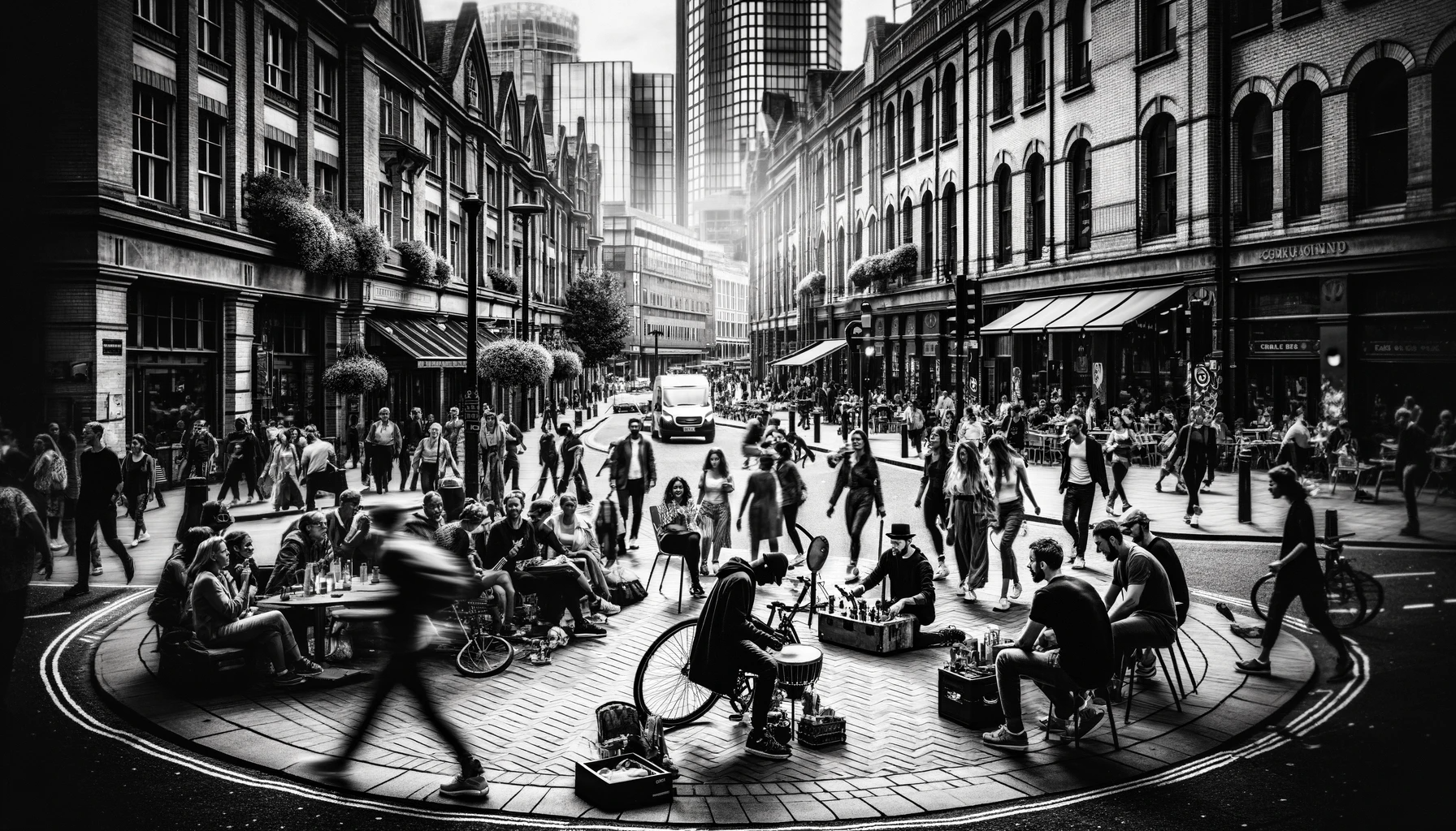 Black and white photo depicting the dynamic energy and candid moments of urban street life.