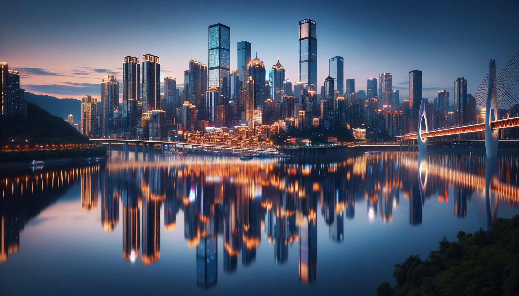 High-resolution photo of a city skyline reflected in a serene river, capturing the interplay of urban architecture and natural elements.