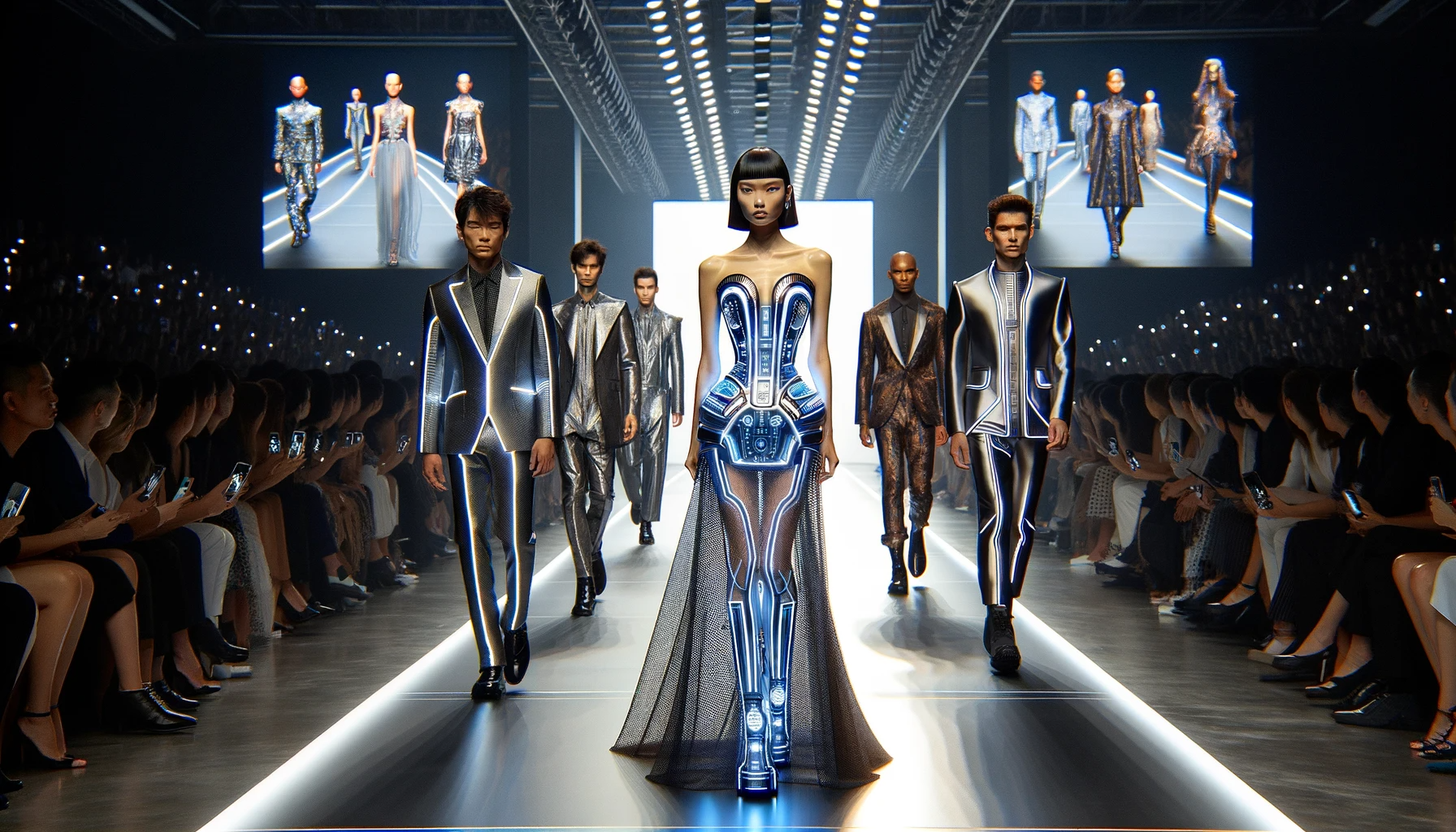 A runway show displaying futuristic fashion, blending high-tech elements with traditional haute couture.