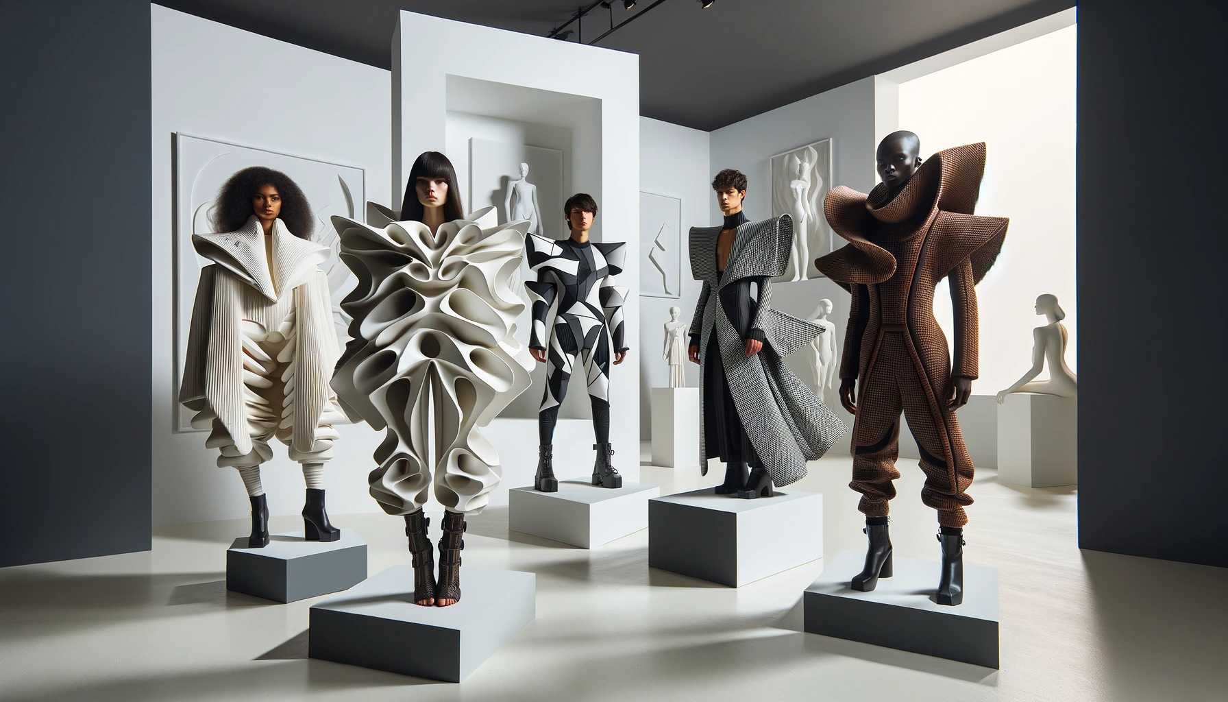 A high-fashion concept showcasing avant-garde designs, with models in abstract, sculptural outfits, presented in a minimalist, modern art gallery setting.