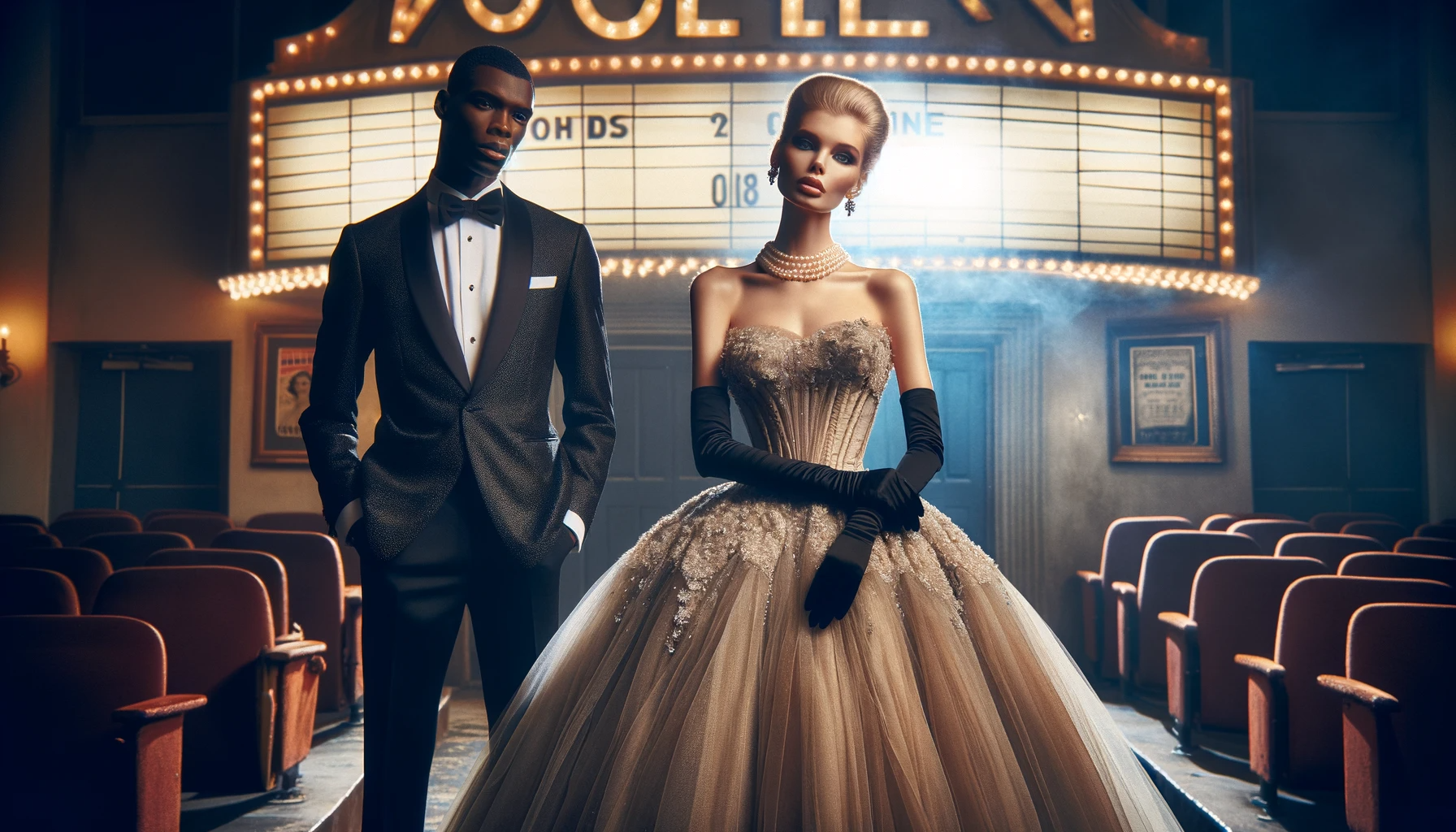 A glamorous fashion setting reminiscent of 1950s Hollywood, with models in elegant gowns and classic tuxedos, against the backdrop of an old cinema.