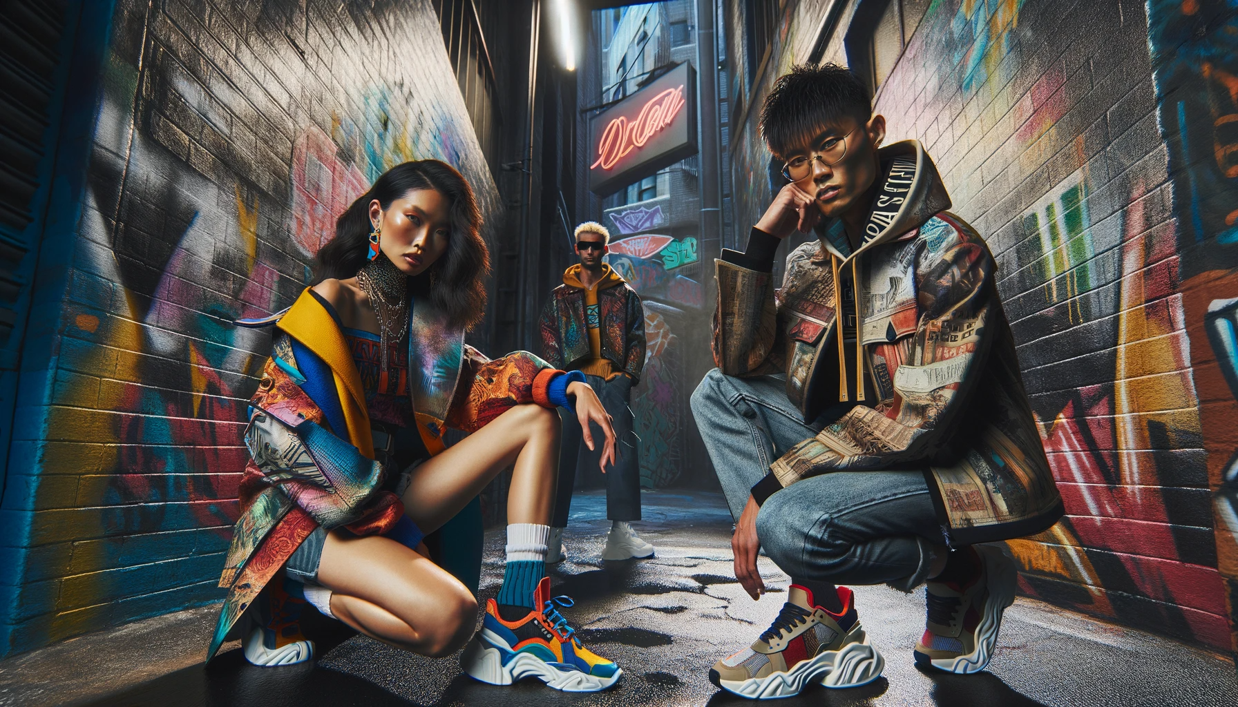 A dynamic urban fashion scene highlighting contemporary streetwear trends, with models posing in a graffiti-filled alley, showcasing bold colors and edgy designs.