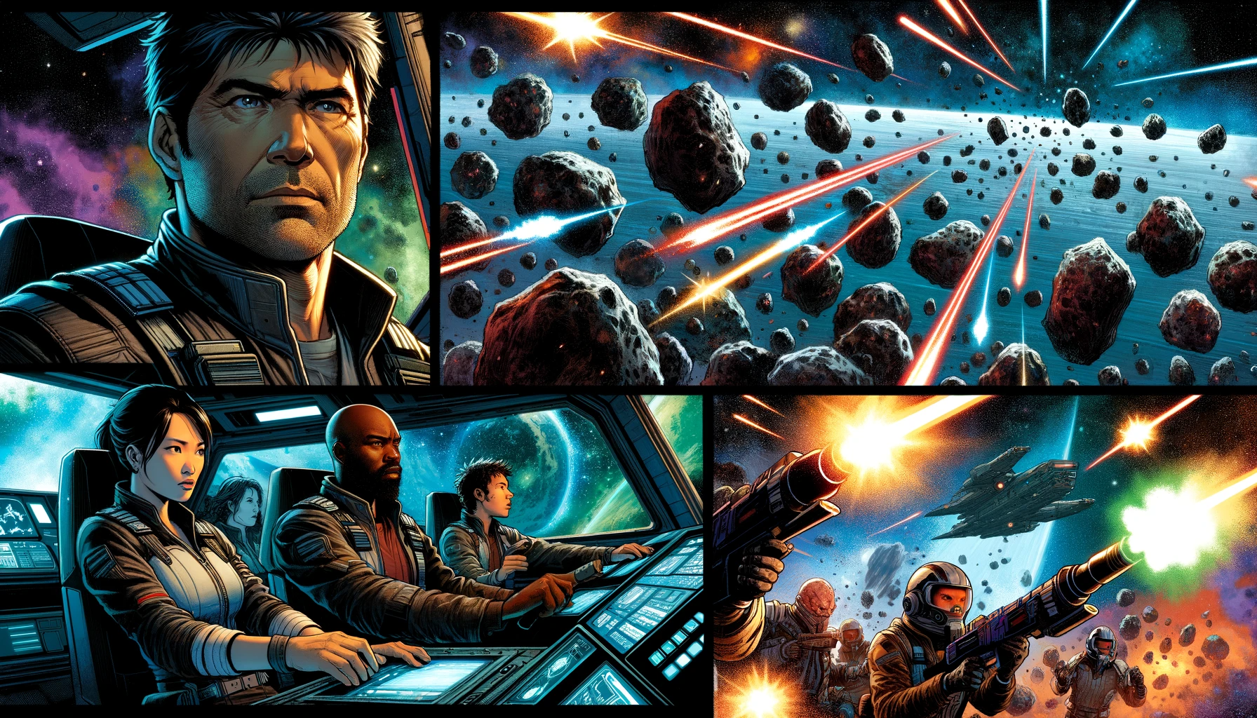 Sequential comic panels depicting: 1) A spaceship captain navigating through an asteroid field. 2) The crew engaging in a laser battle with space pirates. 3) A dramatic escape to a distant, uncharted planet.