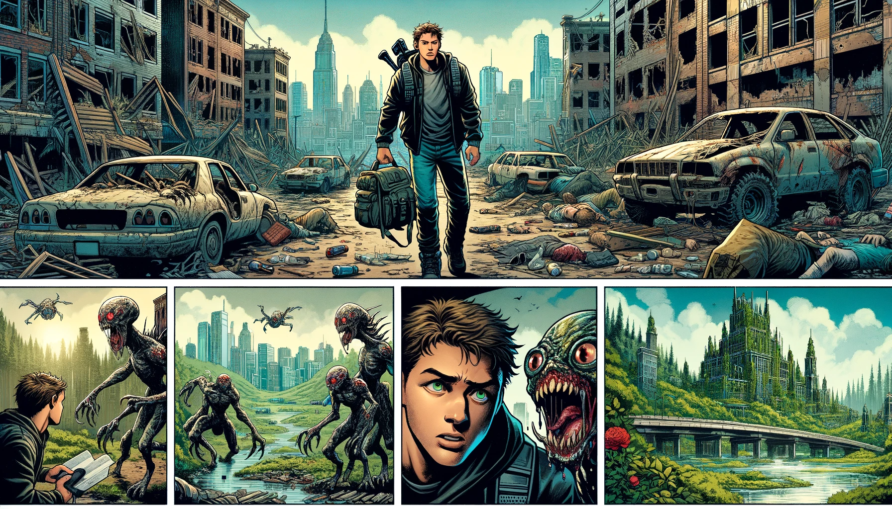 Comic story panels showing: 1) A lone survivor scavenging in a desolate cityscape. 2) A tense encounter with mutant creatures. 3) The discovery of a hidden utopian society amidst ruins.