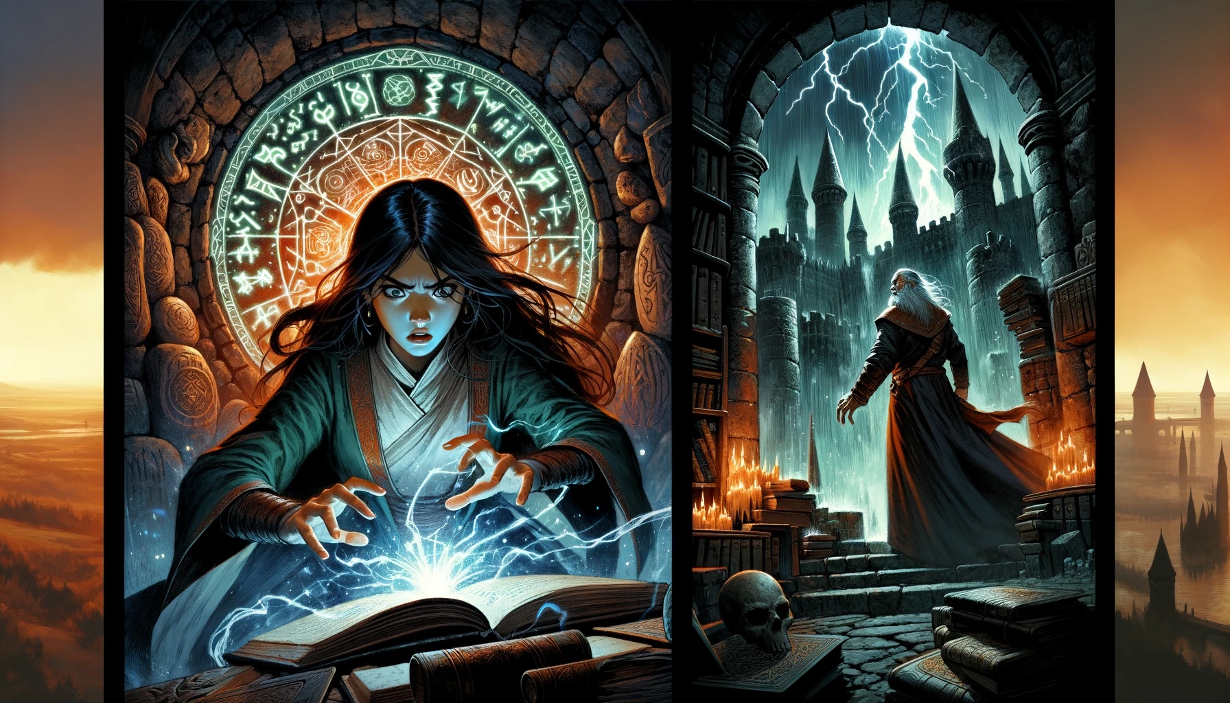 In this two-panel fantasy comic: 1) A young mage in an ancient, rune-carved chamber, unleashing a powerful spell. 2) The final stand on a crumbling castle tower against a dark sorcerer, with a magical storm swirling overhead.