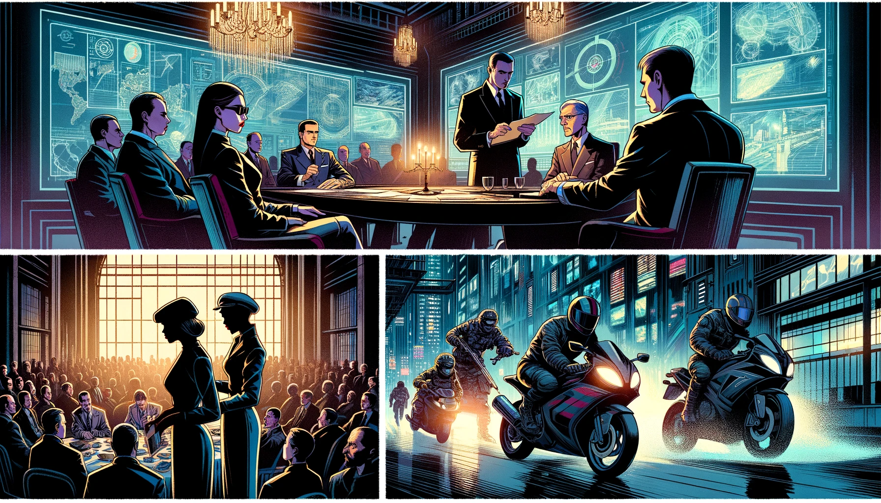 Four-panel spy comic: 1) A tense briefing in a dimly lit underground headquarters. 2) Disguised infiltration at a high-society gala. 3) A high-tech gadgetry encounter in a sleek, modern laboratory. 4) An adrenaline-fueled escape on a motorbike through narrow city streets at night.