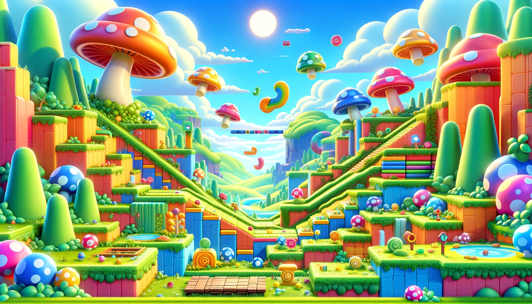 Create a vibrant, side-scrolling landscape reminiscent of Super Mario, with whimsical mushroom-like structures and a colorful, obstacle-filled course.