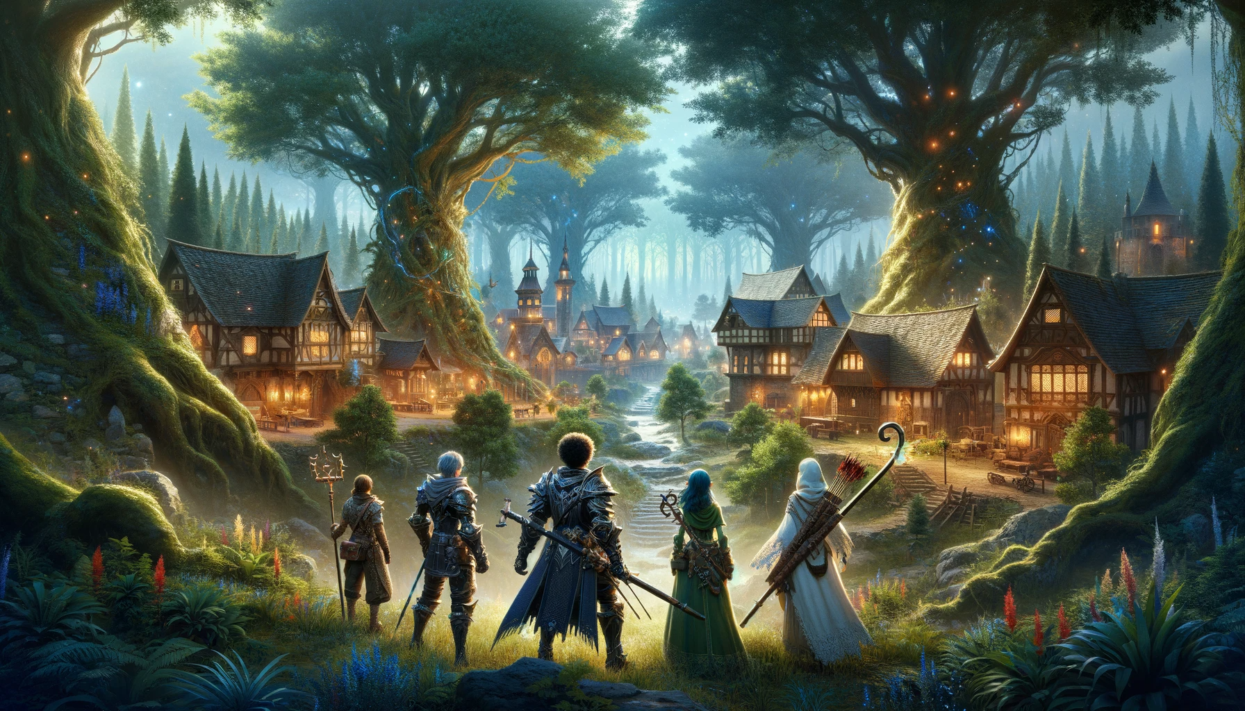 Design an image reminiscent of a fantasy RPG, featuring an enchanted forest landscape, a medieval village, and characters equipped for an epic quest.
