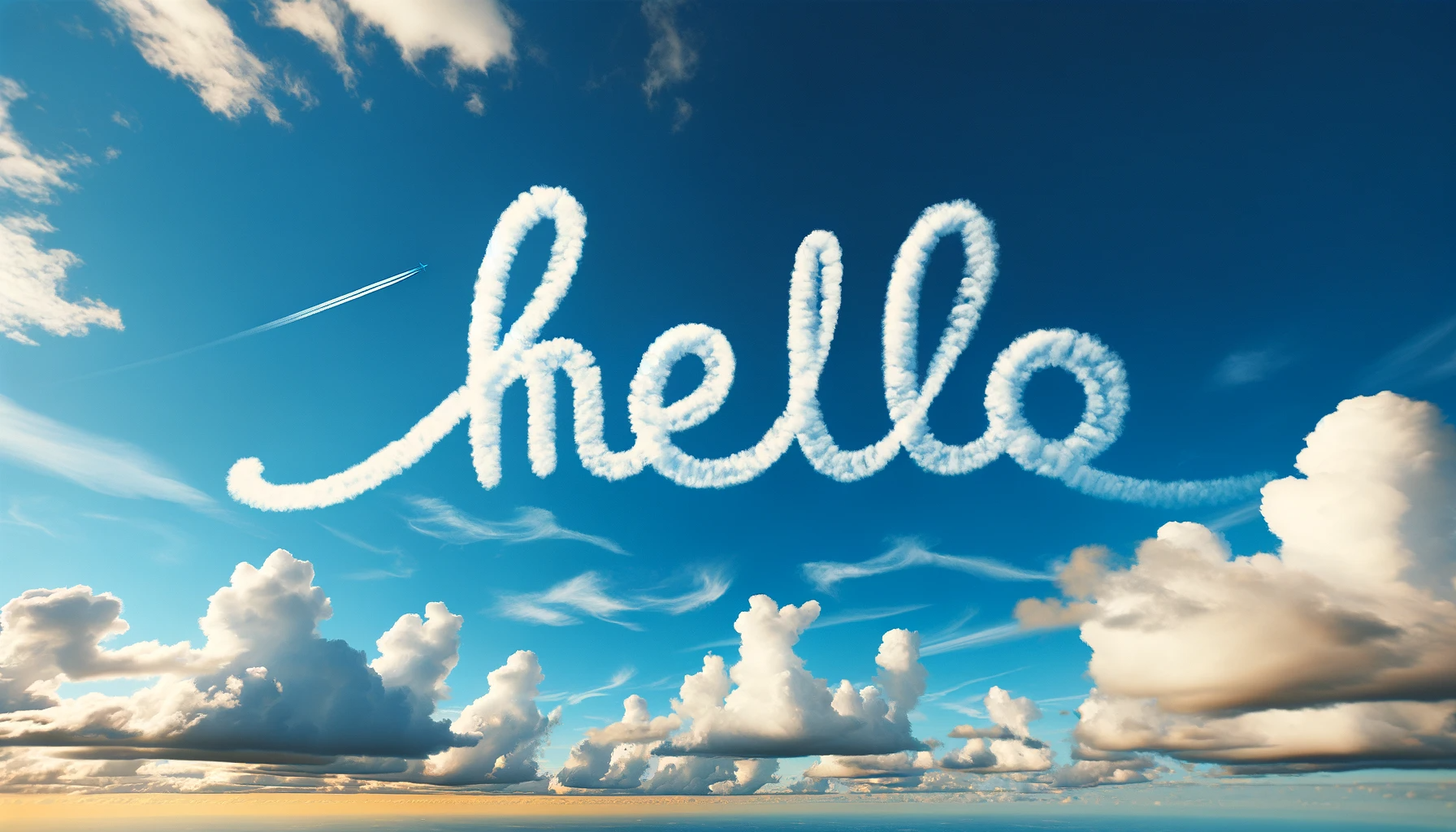 Generate a blue sky with white clouds and the word "Hello" in skywriting.