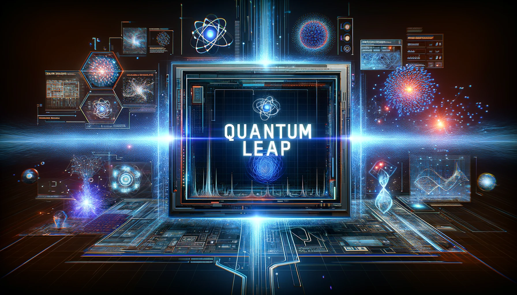 "Quantum Leap" displayed on a digital screen surrounded by quantum computing visualizations