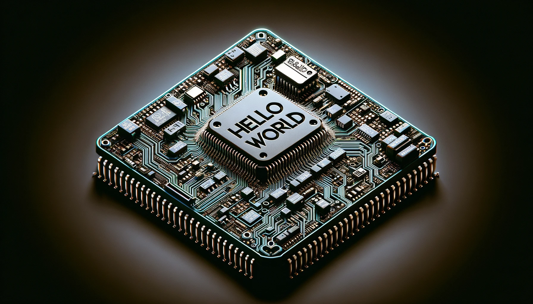 Generate an image of a computer chip, with the phrase 'Hello World' integrated into the circuitry design, symbolizing the intersection of technology and programming.