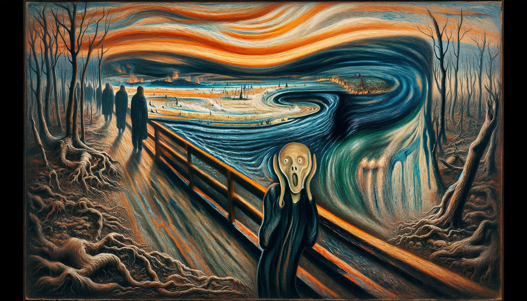 Reinterpret Munch's 'The Scream' to reflect the theme of climate change, with the figure standing before a scene of environmental decay.