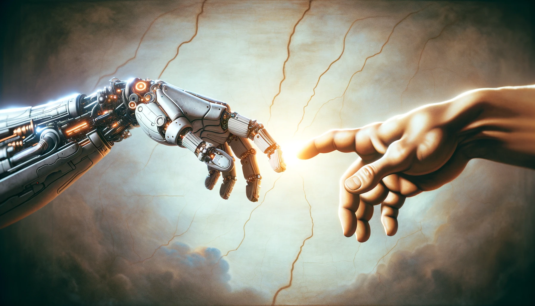 Visualize Michelangelo's 'Creation of Adam' with a robotic hand reaching out to a human hand, symbolizing AI creation.