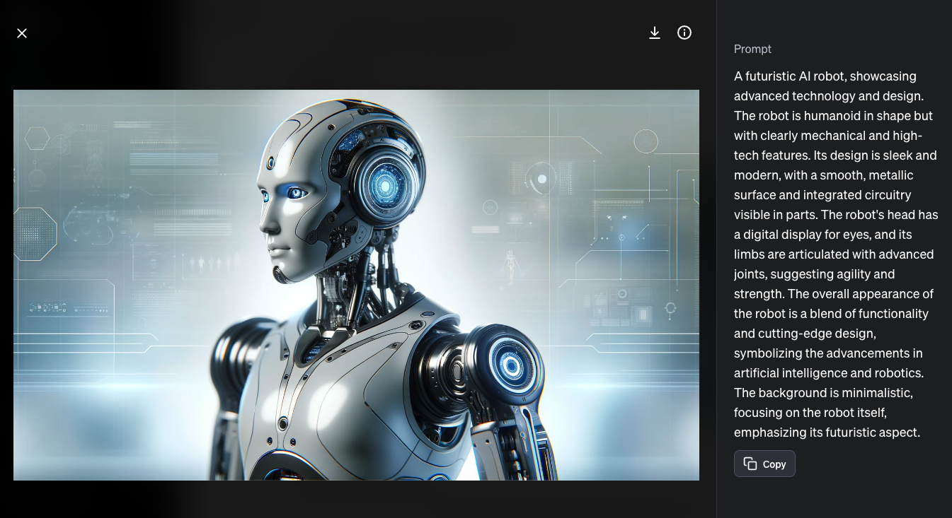 For example, if you enter a simple prompt like "create an image of a futuristic AI robot", this prompt get's augmented by ChatGPT's language model into the following: