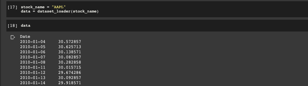 return "$ {0:2f}".format(abs(n))3. dataset_loader - this function connects with a data source and pulls the stock data from it, in this case we're loading data from Yahoo Finance: