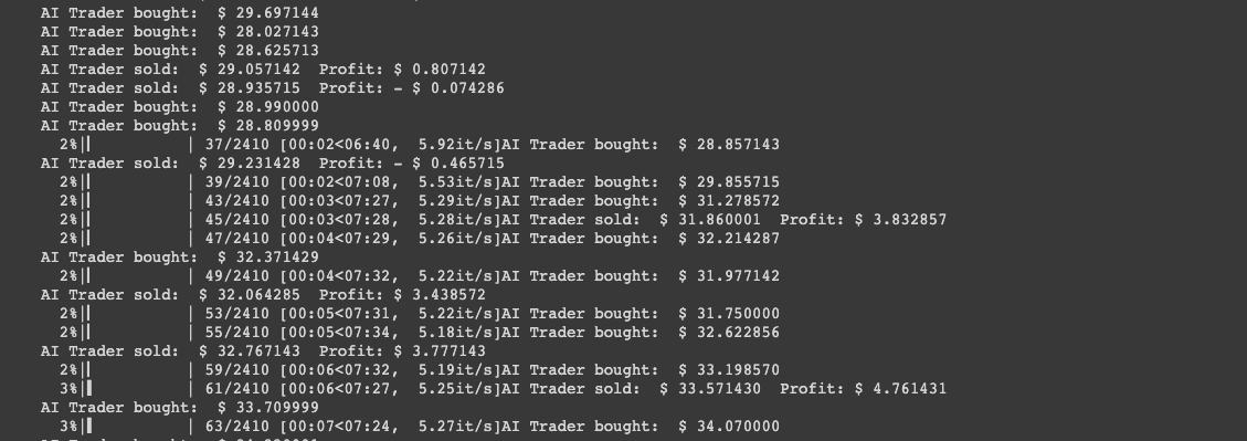 We started by defining an AI_Trader class, then we loaded and preprocessed our data from Yahoo Finance, and finally we defined our training loop to train the agent.