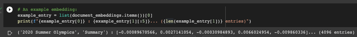# context_embeddings = compute_doc_embeddings(df)Below we can check out an example embedding: