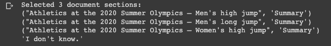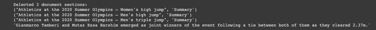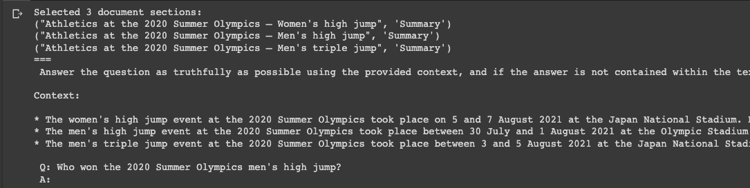 return header + "".join(chosen_sections) + "\n\n Q: " + question + "\n A:"Now let's supply the prompt "Who won the 2020 Summer Olympics men's high jump?" and use our prompt_construct function: