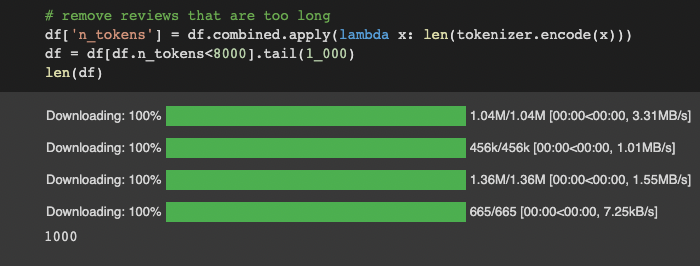 Next up, we'll take a subsample of 1k reviews from this dataset and removes reviews that are too long:
