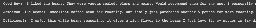As we can see below, each review has the following data: Time, ProductId, UserId, Score, Summary, and Text.