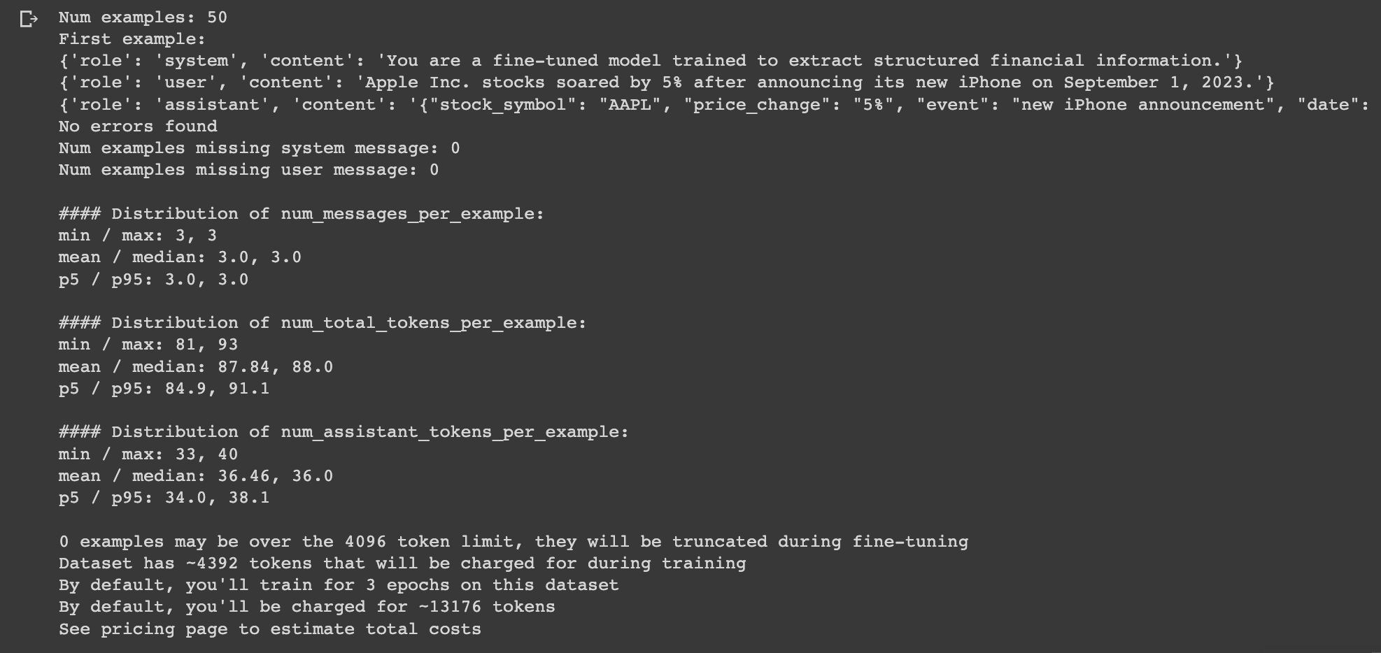 We can also optionally run the dataset through the data formatting script OpenAI provides, which will return something like this if it's formatted correctly: