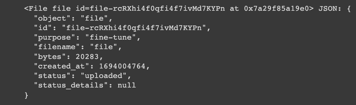 With our training dataset, the next step is to upload the file to OpenAI for fine tuning, which we can do as follows: