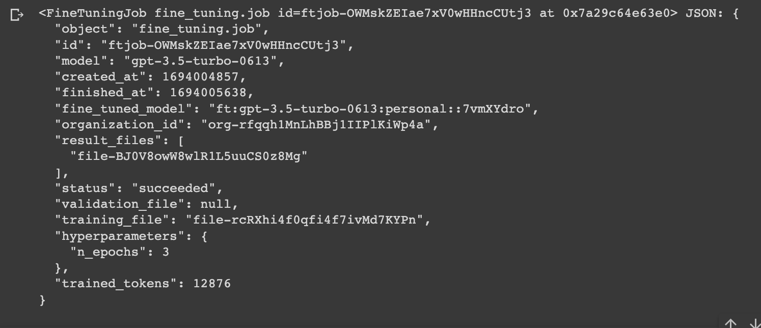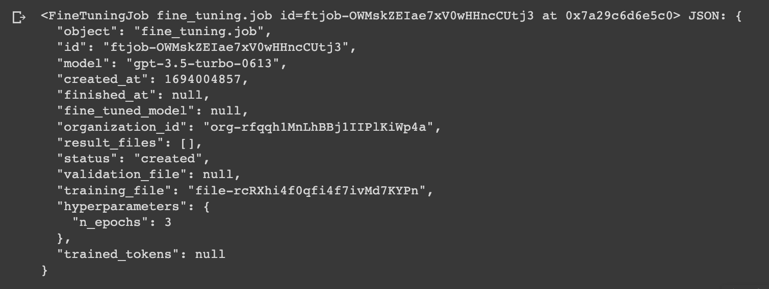 After creating the fine tuning job, we can check the status of it with the ftjob-id just created: