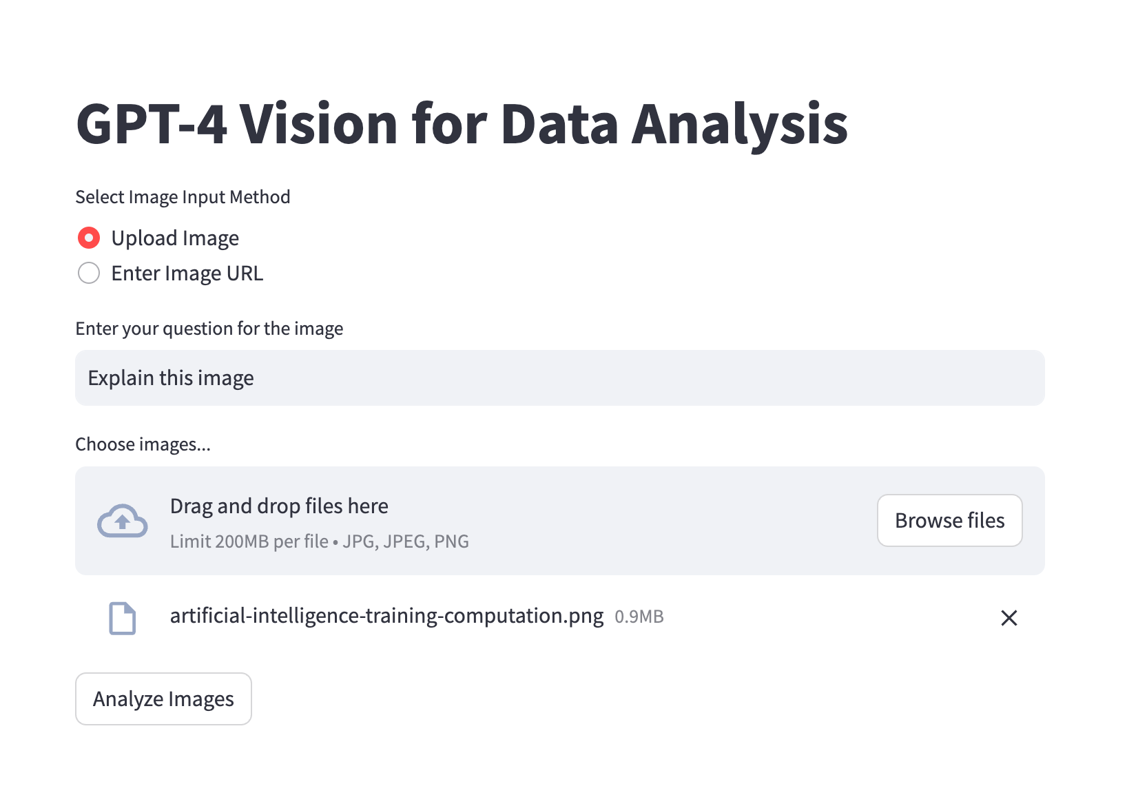 st.set_page_config: Sets the page title andst.titledisplays the title "GPT-4 Vision for Data Analysis" at the top of the app.