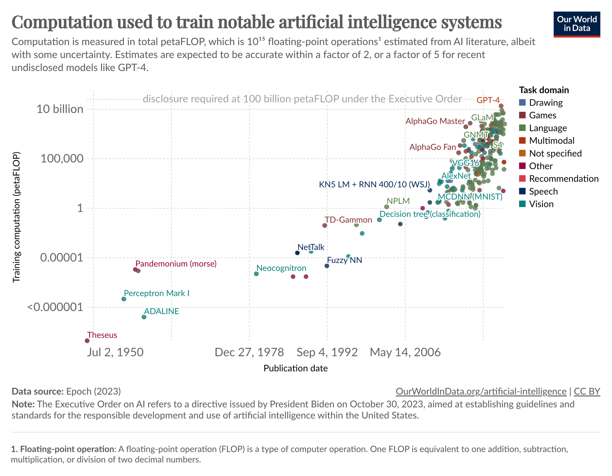 A dashed line near the top of the graph indicates that disclosure of AI computation is mandatory at or above 100 billion petaFLOPs under the Executive Order on AI. This refers to a directive issued by the President of the United States for establishing guidelines and standards for the responsible development and use of AI technology, which includes reporting on the computational resources used for training these AI models.