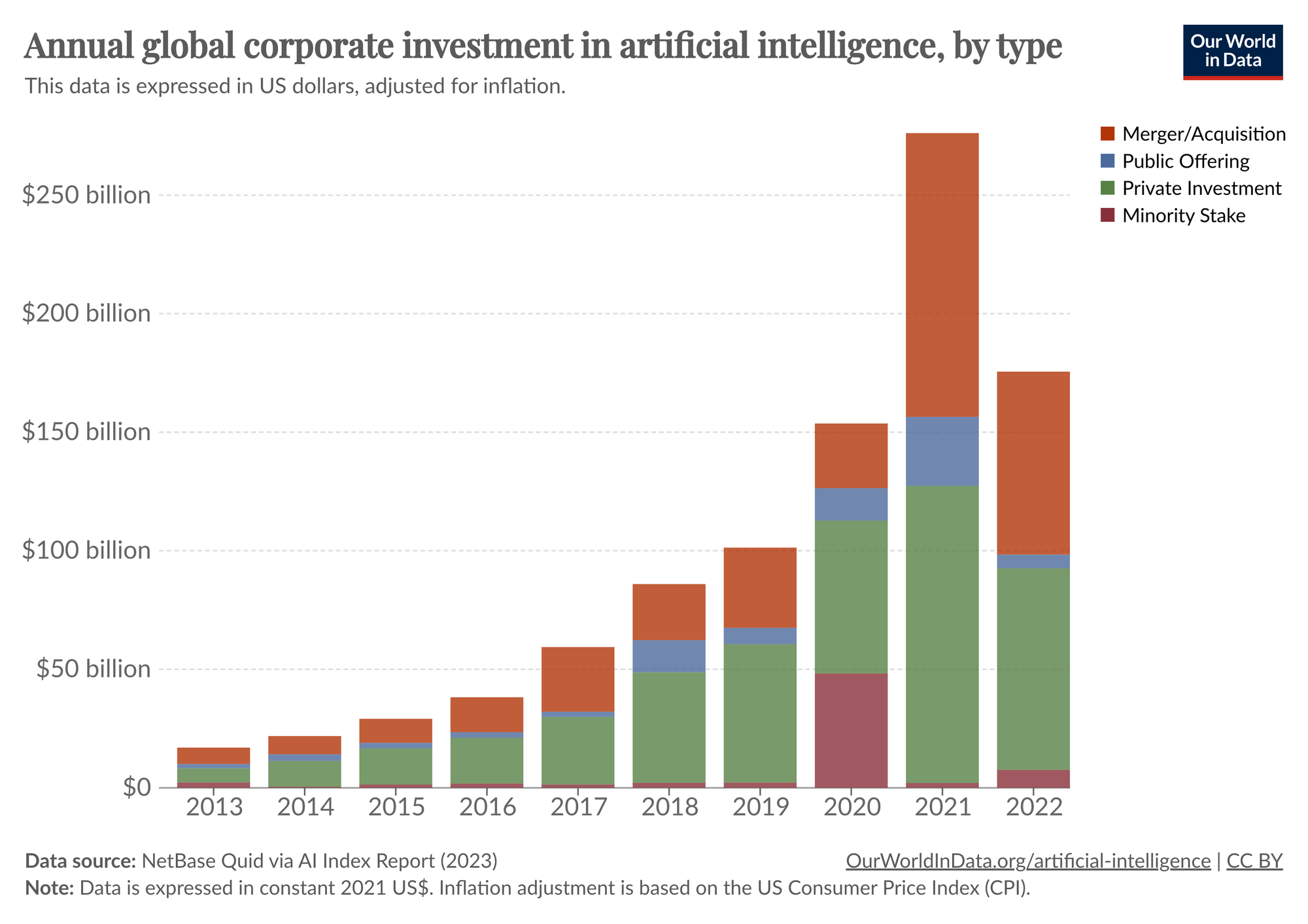 That's all we need. Let's test it out with one more image from Our World in Data: Annual global corporate investment in artificial intelligence, by type.