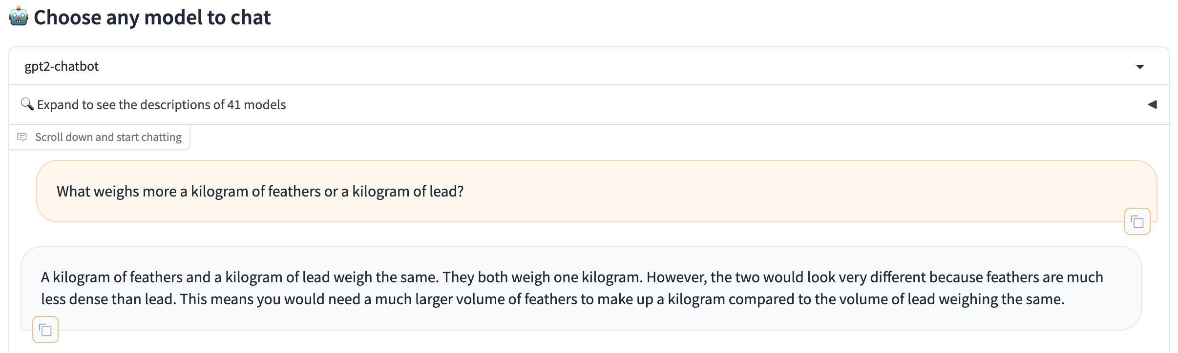 Comparing this to GPT 3.5 Turbo, you can see it still gets it right but in my opinion, the answer is quite a bit worse because it says you "might" need a bigger space for the feathers...